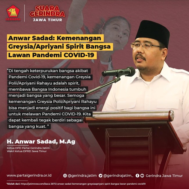 Wakil Ketua DPRD Jatim itu berharap energi positif dari kemenangan Greysia/Apriyani, bisa menjadi spirit tambahan kepada para tenaga kesehatan dan masyarakat, agar segera bangkit dari pandemi COVID-19.