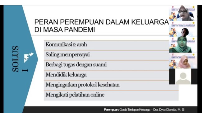 Dihadiri oleh sekitar 65 partisipan yang beragam asal daerah dan instansinya, webinar edukasi ini mendiskusikan tentang bagaimana perempuan dapat berperan pada pengelolaan informasi, serta menyikapi kondisi COVID-19 secara bijak dalam keluarga.
