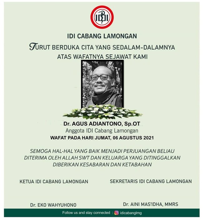 "Iya, Almarhum meninggal dunia hari ini karena terpapar COVID-19 dan sebelumnya menjalani perawatan di rumah sakit," kata Ketua IDI Cabang Lamongan dr Eko Wahyuhono saat dikonfirmasi detikcom, Jumat (6/8/2021).