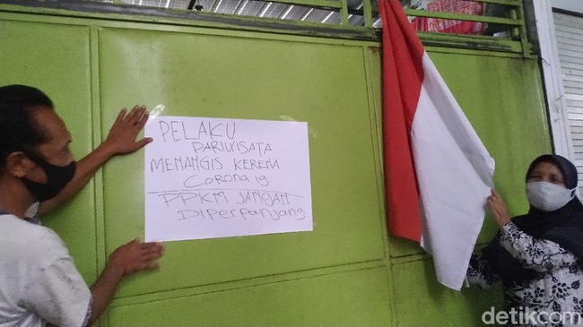 Walaupun mereka mengaku menderita, namun mereka tetap semangat merayakan Hari Kemerdekaan RI ke-76. Cara satir mereka ekpresikan dengan memajang bendera merah putih bersama beberapa lembar tulisan di kertas karton putih. Karton itu di antaranya bertuliskan 'Para Pedagang Kaliren Maneh (PPKM) jangan diteruskan', 'Pelaku Pariwisata Menangis Karena Corona PPKM Jangan Diperpanjang lagi', dan 'Jangan Menyerah Karena Corona, Indonesia Merdeka Sudah 76 Tahun'.