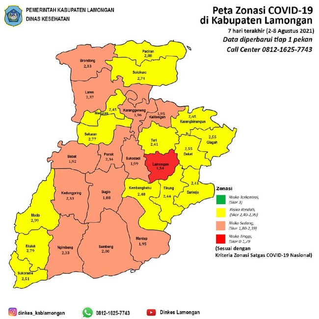 Peta zonasi COVID-19 di seluruh kecamatan di Lamongan juga semakin membaik dan tinggal menyisakan 1 kecamatan dengan status zona merah, yaitu Kecamatan Lamongan. Selain itu, peta zonasi yang diperbarui setiap pekan itu juga menyebut jika ada 14 kecamatan di Lamongan dengan status zona kuning dan 12 kecamatan dengan status zona oranye.