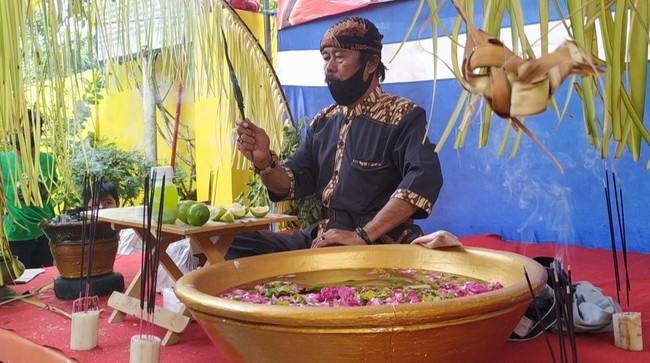 Pantauan detikcom, di dalam bangunan itu juga tersimpan beberapa pusaka berupa keris dan tombak. Aroma dupa kemenyan beradu harum bunga setaman, memenuhi ruangan beratap pendek yang didominasi cat warna kuning emas ini. Satu di antara keris itu adalah Keris Umyang Jimbe, pusaka leluhur yang diwariskan bagi warga desa ini. Sego berkat dengan lauk lengkap, dihantarkan sebagai sajen (sesaji) kepada para leluhur desa ini.