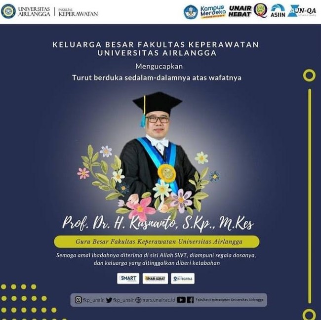 Kabar duka ini dibenarkan oleh Dekan Fakultas Keperawatan Universitas, Prof Dr Ah Yusuf S SKp MKes. Prof Kusnanto meninggal terpapar COVID-19 dan telah dirawat selama 33 hari.