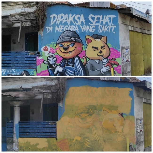 Meski telah terhapus cat krem, namun secara samar gambar dua karakter dan tulisan 'Dipaksa Sehat di Negara yang Sakit' masih tetap terlihat.