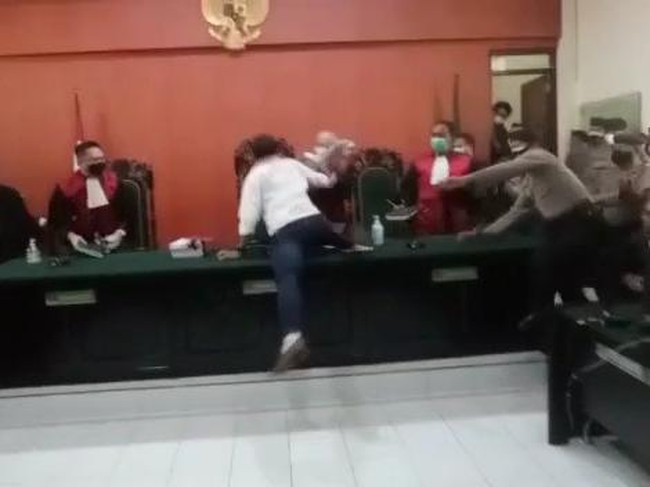 Sontak saja hal itu membuat beberapa orang di dalam ruangan sidang melerai aksinya. Polisi yang bersiaga kemudian mengamankan Yunus. Kemudian, Yunus dikawal ketat polisi dan Pengadilan Negeri (PN) Banyuwangi keluar sidang.