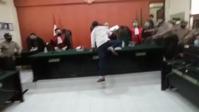 "Woooooyy," teriak Yunus sambil Loncat ke meja majelis hakim, Kamis (19/8/2021).