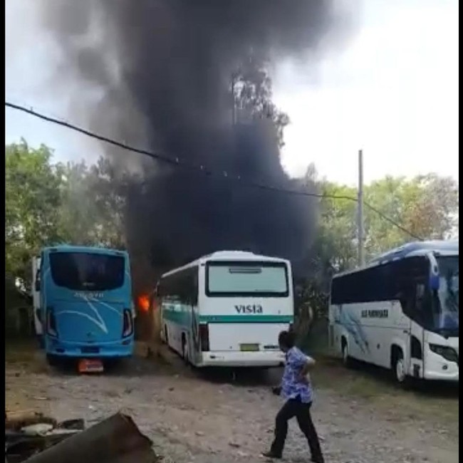 Di lokasi ada 5 bus yang terparkir milik Travel Sinergi. Ada satu yang terbakar habis, dan satu lagi terbakar 15 persen.