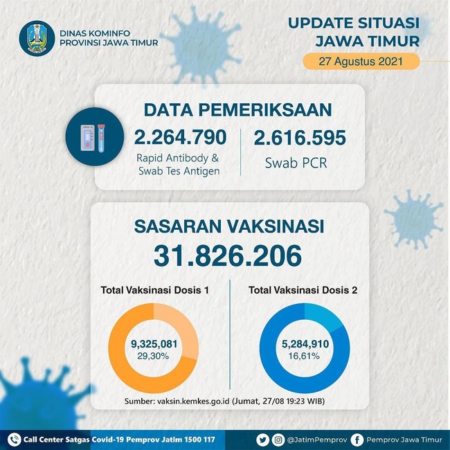 Data yang dihimpun detikcom dari Kementerian Kesehatan di website vaksin.kemkes.go.id menyebut Jatim menargetkan 31.826.206 masyarakat untuk divaksin. Yang mana terdiri dari tenaga kesehatan, lansia, petugas publik, masyarakat rentan dan masyarakat umum hingga pelajar berusia 12 hingga 17 tahun.