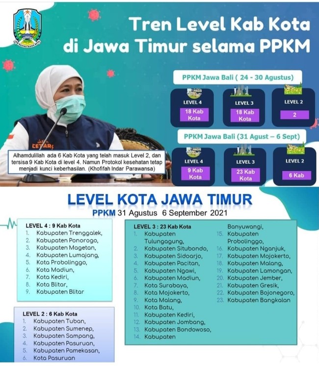 "Alhamdulillah sesuai Inmendagri No 38 Tahun 2021 yang terbit pada tanggal 30 Agustus 2021, PPKM di Jatim saat ini level 2 terdapat di 6 daerah, 3 di 23 daerah dan level 4 di 9 daerah," tulis Khofifah dalam akun instagramnya @khofifah.ip yang dilihat detikcom di Surabaya, Rabu (31/8/2021).