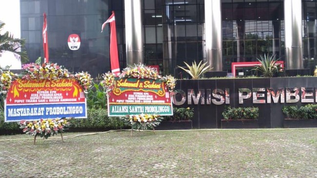Tampak ada dua karangan bunga di kantor KPK di Jakarta. Dua karangan bunga dari warga dan Aliansi Santri Probolinggo itu bertuliskan 'Selamat dan Sukses kepada KPK Atas Penangkapan Bupati Probolinggo Puput Tantriana Sari dan Hasan Aminuddin'.