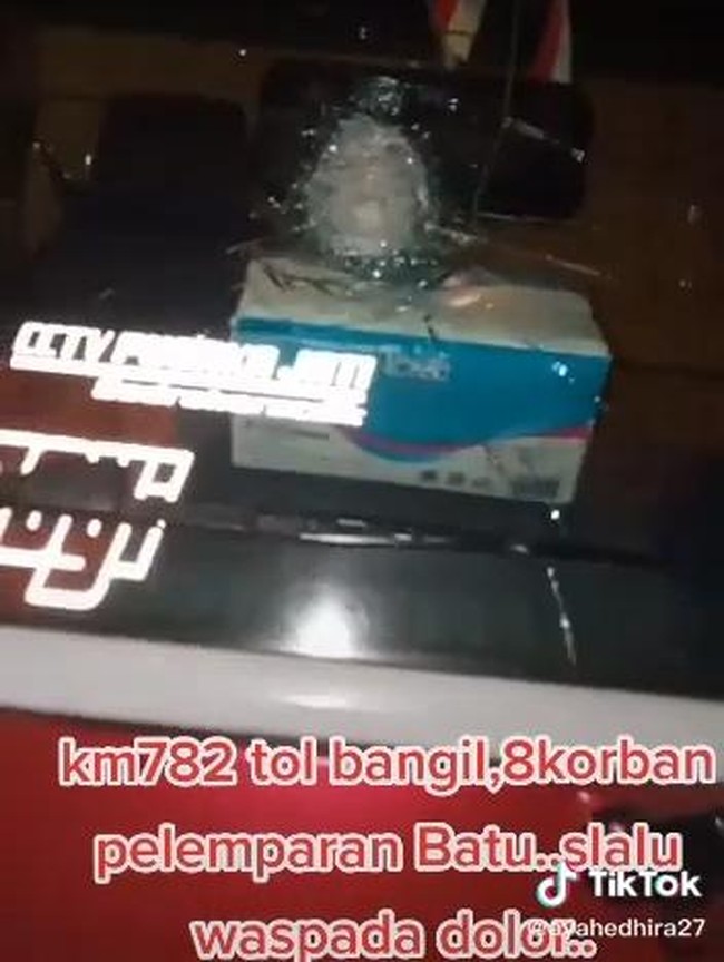"Hati-hati, daerah KM 782 Bangil ada pelemparan batu di tengah tol. Ini saya kena ini," kata pria dalam video yang dilihat detikcom, Kamis (2/9/2021).