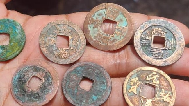 Ditelisik lebih dekat, uang kepeng yang ditemukan warga tersebut berbahan logam dengan bentuk bundar dan bolong di bagian tengahnya. Di kedua sisi mata uang tersebut juga terdapat pahatan huruf yang menyerupai huruf China.