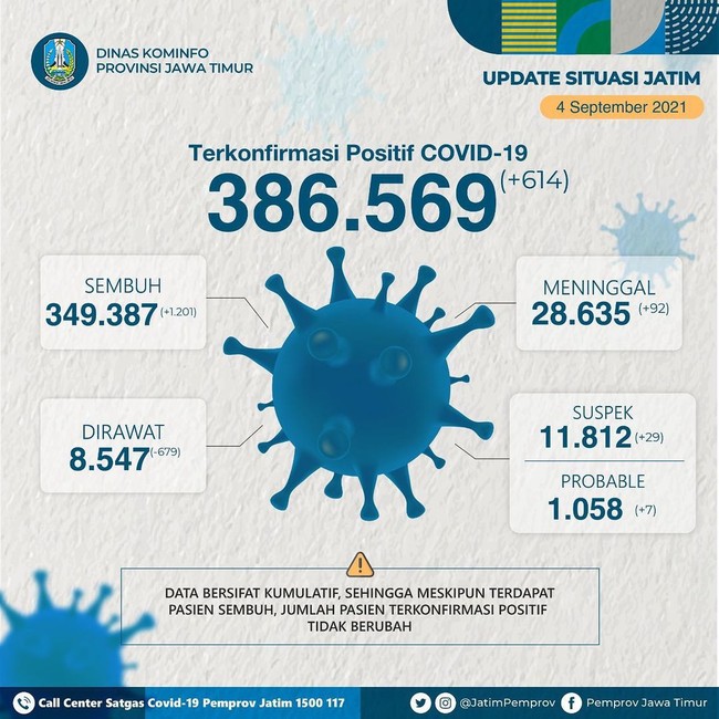 Selain itu, tambahan pasien di Jatim ada 614, yang sembuh ada 1.201, lalu yang meninggal dunia 92. Untuk kumulatif kasus COVID-19 sepanjang pandemi di Jatim ada 386.568, kumulatif kasus sembuh ada 349.387 dan total kematian akibat COVID-19 ada 28.635.
