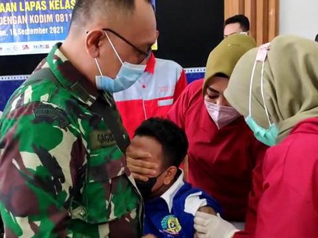 Tak hanya satu napi, beberapa rekannya juga takut divaksin. Mereka terpaksa dipegang beberapa orang atau bahkan menutup matanya takut melihat jarum suntik.