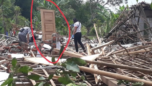 "Kok nggak jatuh ya (Pintunya), padahal semua bagian bangunan ambruk," bisik warga yang melihat lokasi ledakan yang menewaskan dua orang di Dusun Macan Putih, Desa Pekangkungan, Kecamatan Gondangwetan , Senin (13/9/2021).