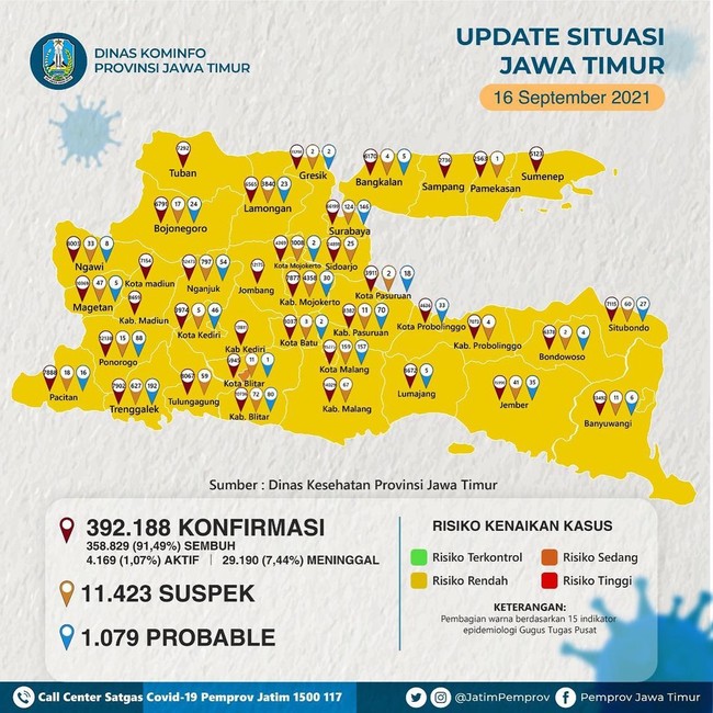 Provinsi Jawa Timur kini didominasi zona kuning atau wilayah dengan risiko rendah penyebaran COVID-19. Saat ini kasus aktifnya tercatat ada 4.169.