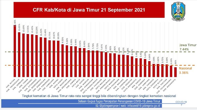 Case Fatality Rate (CFR) atau tingkat kematian akibat COVID-19 di Jatim mencapai 7,44 persen. Ini dinilai tinggi jika dibandingkan tingkat kematian nasional yang hanya 3,36 persen.
