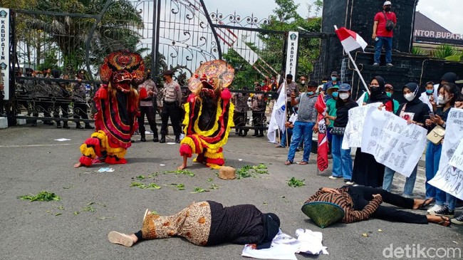 Massa aksi melakukan orasi secara bergantian dan menyanyikan lagu-lagu perlawanan. Mereka juga menggelar teatrikal dengan menampilkan dua Barongan sebagai simbol pemerintah atau kekuasaan. Dan petani sebagai obyek praktik penindasan.