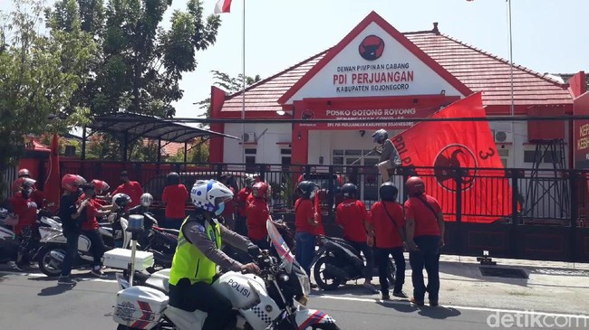 Menggunakan baju kebesaran dan bendera partai, para kader banteng moncong putih itu langsung berorasi begitu tiba di kantor DPC PDIP Bojonegoro. Mereka tetap berorasi meski kantor partai tersebut tutup dan terkunci.