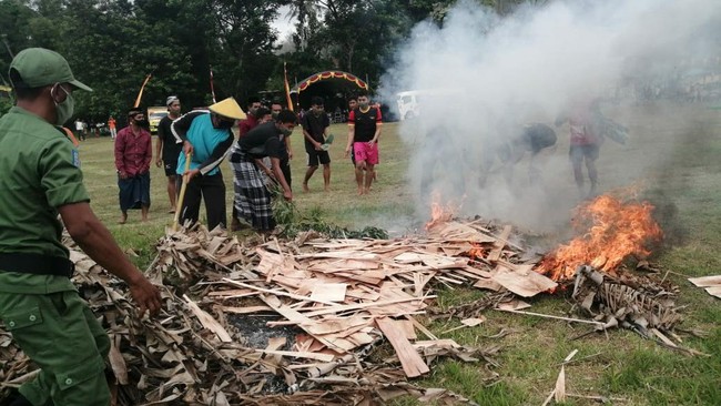 Teriakan terdengar lantang hingga seantero wilayah. Warga yang mendengarnya bergegas menuju titik kebakaran. Mereka tampak membawa peralatan pemadaman tradisional. Tampak pula anggota Satlinmas bersama TNI/Polri dalam simulasi ini.