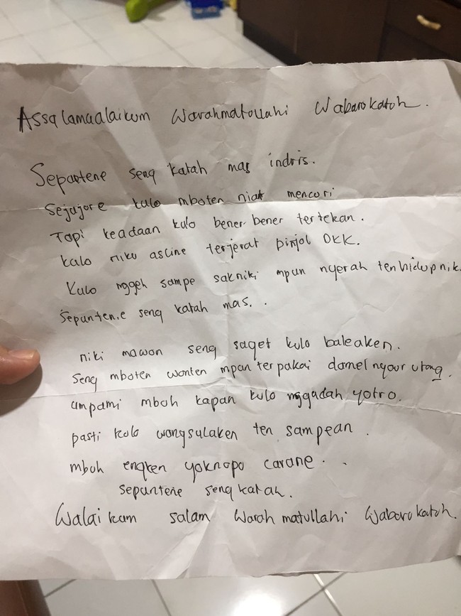 Indris mengatakan dalam surat itu si pencuri juga meminta maaf telah melakukan pencurian. Ia melakukannya karena terpaksa. Si pencuri juga berjanji akan mengembalikan kerugian barang (perhiasan) yang telah ia jual jika ia sudah punya uang.