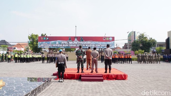 Ratusan petugas gabungan disiagakan untuk mengantisipasi bencana alam di Sidoarjo. Apel gelar pasukan dilakukan di Mapolresta Sidoarjo.