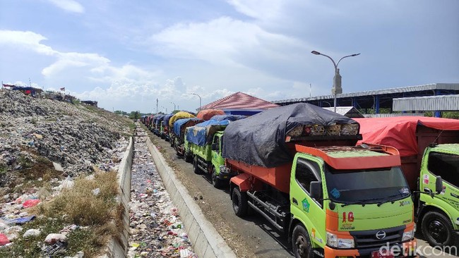 Pantauan detikcom di TPA Jabon, ada puluhan truk sampah yang sedang antre untuk membongkar muatan. Truk berderet di sisi Utara TPA.