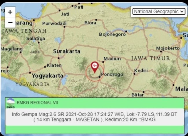 "Gempa kecil akibat sesar aktif di antara Magetan-Ponorogo sekitar pukul 17.24.27 WIB," tulis Koordinator Bidang Mitigasi Gempa Bumi dan Tsunami BMKG, Daryono di twitternya, Kamis (28/10/2021).