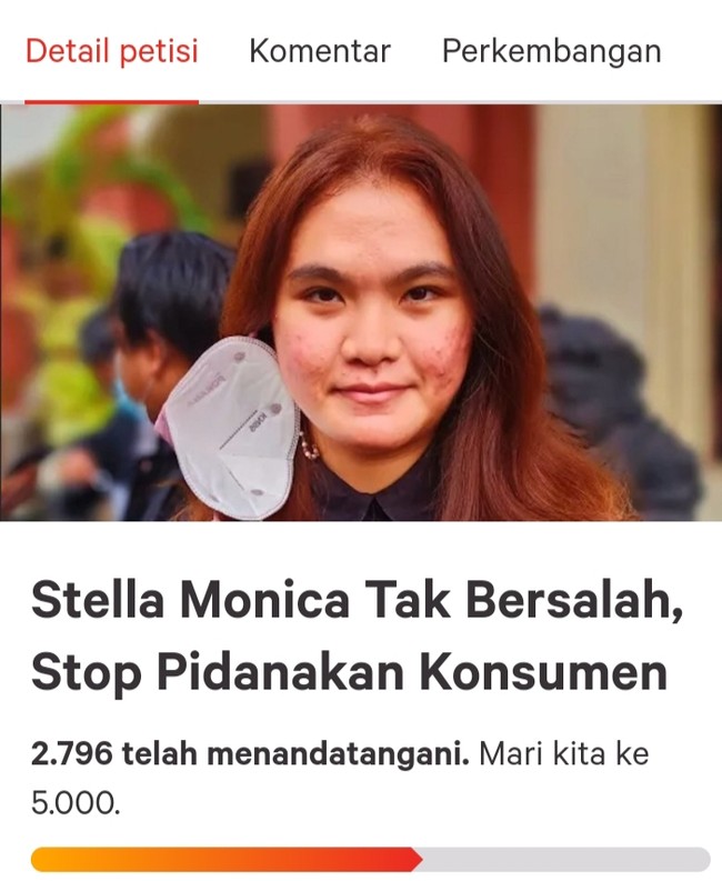 Ribuan orang menandatangani petisi 'Stella Monica Tak Bersalah, Stop Pidanakan Konsumen'. Petisi itu muncul usai Stella dituntut 1 tahun penjara dan denda Rp 10 juta subsider 2 bulan oleh jaksa. Stella dinilai telah mencemarkan nama baik Klinik L'VIORS Surabaya.
