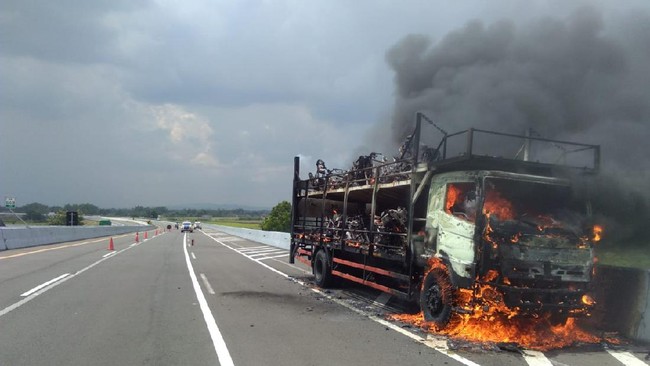 "Betul ada insiden kebakaran kendaraan di ruas Tol Madiun-Nganjuk tepatnya KM 669.200 A. Ada 39 sepeda motor yang diangkutnya ikut ludes terbakar," ujar Kasat PJR Polda Jatim AKBP Dwi Sumrahadi.