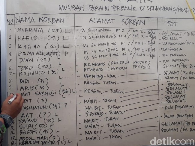 Data ini merupakan data sementara nama-nama penumpang perahu yang teridentifikasi. Dari 18 korban atau penumpang ini, 5 orang warga Bojonegoro, 11 orang warga Tuban, dan 2 orang warga luar daerah. Dari data yang dihimpun detikcom, ada 11 korban yang telah ditemukan dalam kondisi selamat.