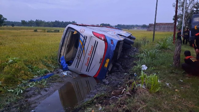 Sampai di lokasi, pengemudi hilang kendali hingga bus terguling di selokan persawahan. Bus dikemudikan oleh Imam Hambali (47), warga Desa Plosogenuk, Perak, Jombang.