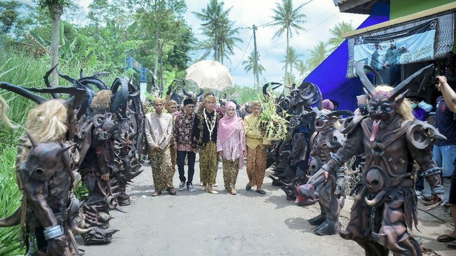 Pernikahan di Pagelaran, Kabupaten Malang, viral karena pengiring pengantinnya berkostum unik. Mereka merupakan pemuda desa setempat, yang mayoritas pegiat seni.