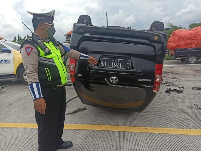 "Tiba-tiba mobil mengalami ban selip sehingga kendaraan oleng ke kanan dan menabrak pembatas jalan. Mobil terbalik hingga menghadap ke selatan berada di lajur cepat," kata Imam.