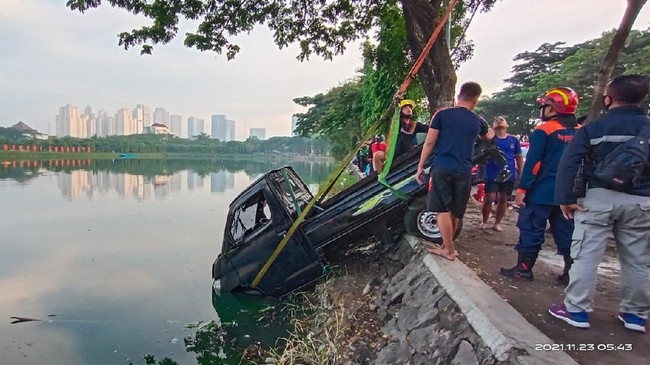 Sementara itu, tim rescue dari Dinas Pemadam Kebakaran melakukan evakuasi mengangkat mobil tersebut.