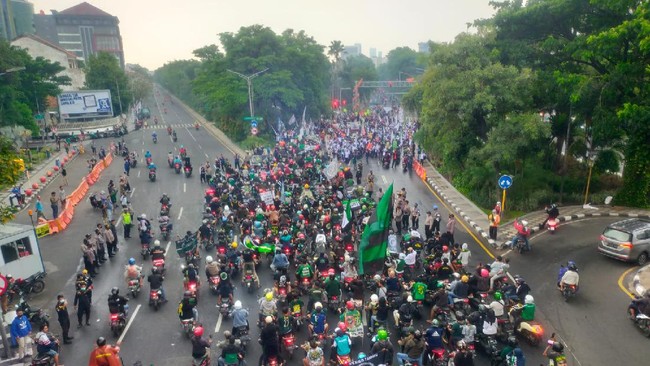 Pantauan detikcom, massa buruh memakai sejumlah atribut. Mereka juga membawa serta bendera serikatnya masing-masing.