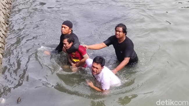 Setelah ditunggu cukup lama, ternyata I tak juga keluar. 8 Polisi kemudian terjun ke sungai dari dua sisi. Dan 4 polisi lalu masuk ke bawah jembatan. Sementara 4 polisi lain berada di luar bawah jembatan sambil menghalau sampah dan eceng gondok yang ikut mengalir terbawa arus sungai.