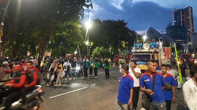 Dari pantauan detikcom, pukul 17.45 WIB buruh mulai membubarkan diri. Jalan Gubernur Suryo pun padat dan macet karena harus antre untuk melintas.