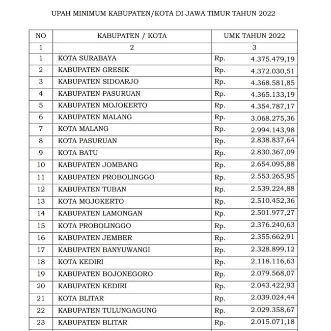 Berikut Besaran UMK Tahun 2022 di 38 Kabupaten/Kota di Jawa Timur: