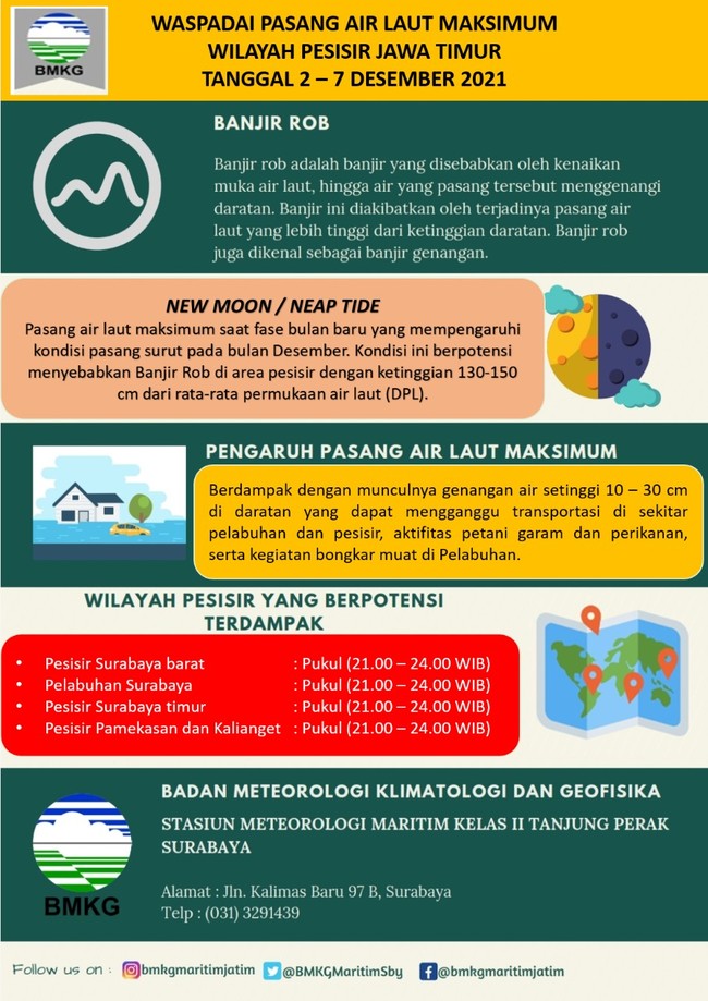 "Waspadai fenomena pasang maksimum air laut yang berpotensi mengakibatkan banjir rob terjadi pada tanggal 2 hingga 7 Desember 2021," kata Daryatno dari keterangan yang diterima detikcom di Surabaya, Kamis (2/12/2021).