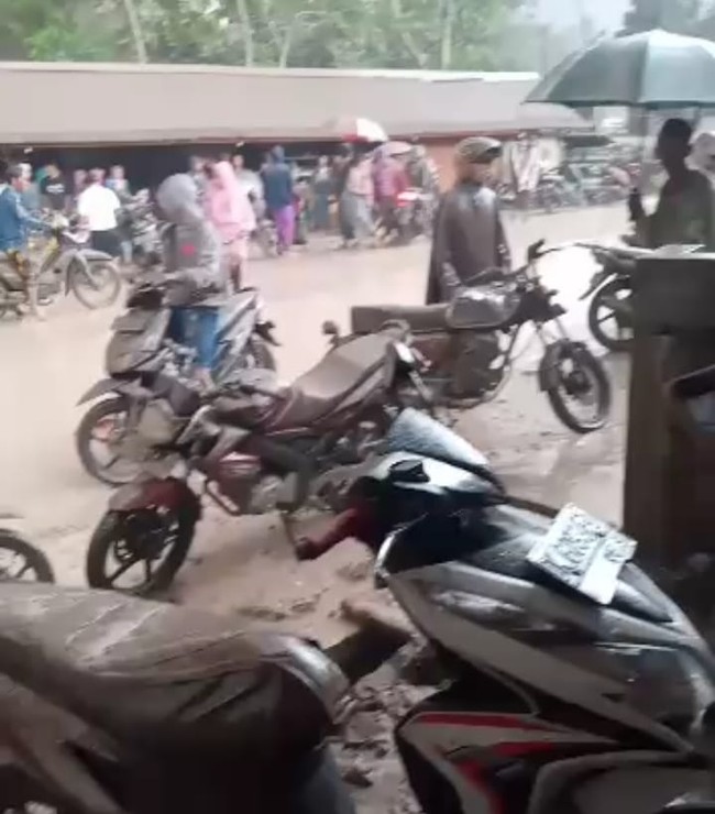 Warga yang berada di tengah lapangan itu tampak berlarian dan menaiki kendaraan yang ada di depannya. Di antaranya sepeda motor, pikap, dan truk.