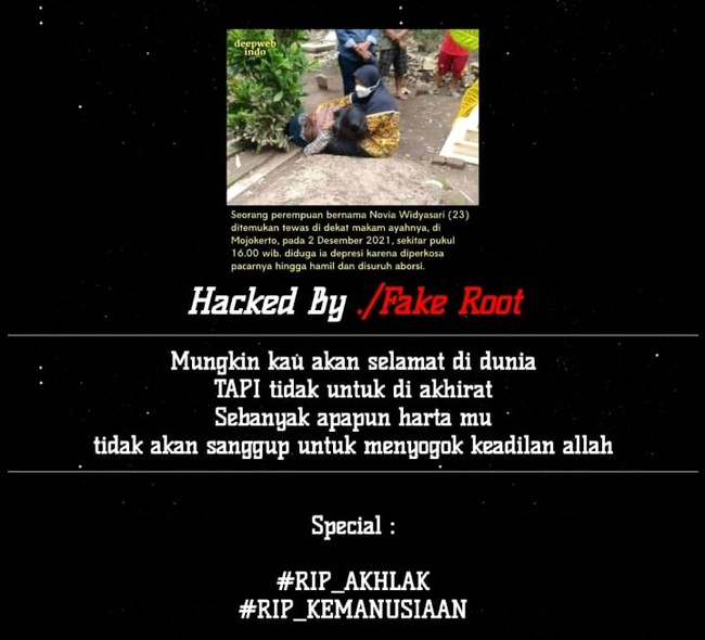 Saat terkena gangguan hacker, tampilan situs sempat berubah. Adapun di situs itu dipasang foto NWR, mahasiswi asal Mojokerto yang viral karena tewas bunuh diri di samping makam ayahnya.