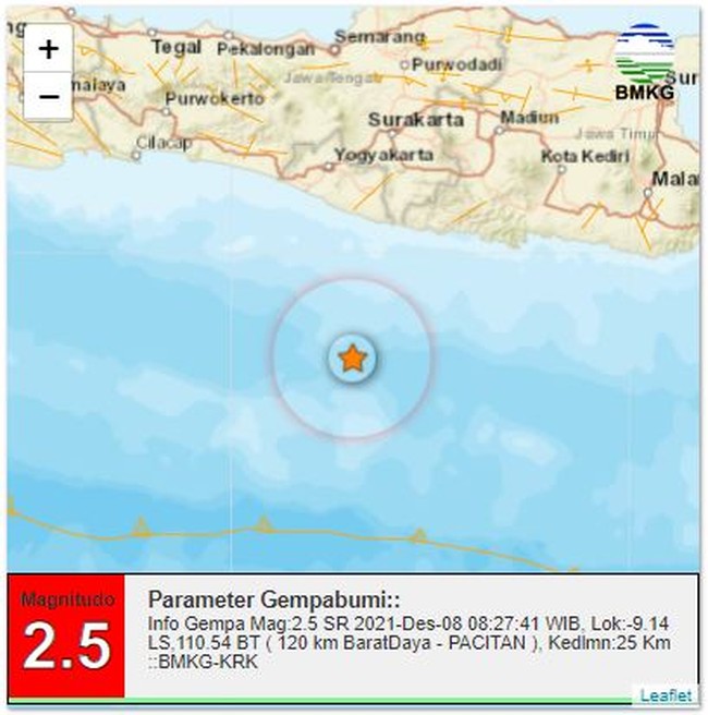 "Gempa Pacitan terjadi pukul 08:27:41 WIB," tulis BMKG Stasiun Geofisika Klas III Karangkates Malang dalam keterangannya yang dilihat detikcom di Surabaya, Rabu (8/12/2021).