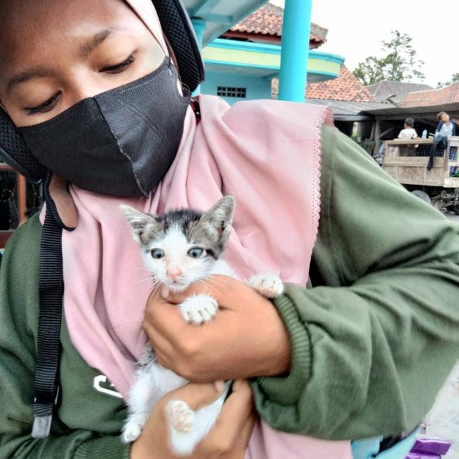 "Astaghfirullah hal adzim. Ayo...ayo... pulang. Ayo nak, pulang nak. Endi babon (induk) mu. Luwe (lapar) ya," kata relawan tersebut sambil mengangkat anakan kucing tersebut.