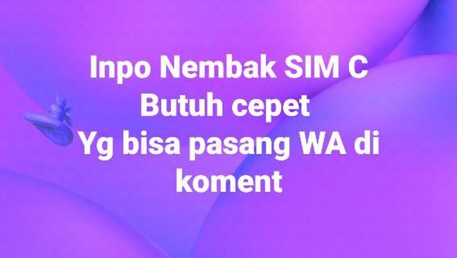 Ada dua unggahan soal tersebut. Pertama, 'Inpo Nembak SIM C Butuh cepet Yg bisa pasang WA di koment'. Yang kedua, 'Inpo ne lur, agen SIM A/C sg aman terpercaya n murah area ponorogo sek enek gk ya?'.