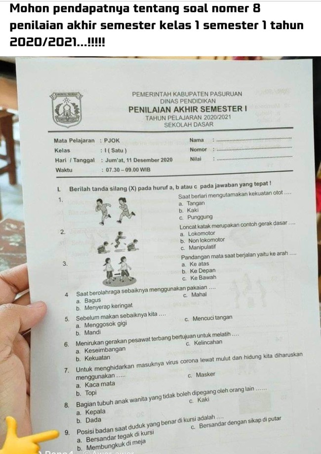 Sebelumnya, wali murid SDN III Desa Plososari, Kecamatan Grati, Kabupaten Pasuruan mengeluhkan salah satu soal ujian dalam lembar Penilaian Akhir Semester I mata pelajaran PJOK kelas 1 tahun pelajaran 2020/2021. Lembar penilaian itu dikeluarkan Dinas Pendidikan Kabupaten Pasuruan.
