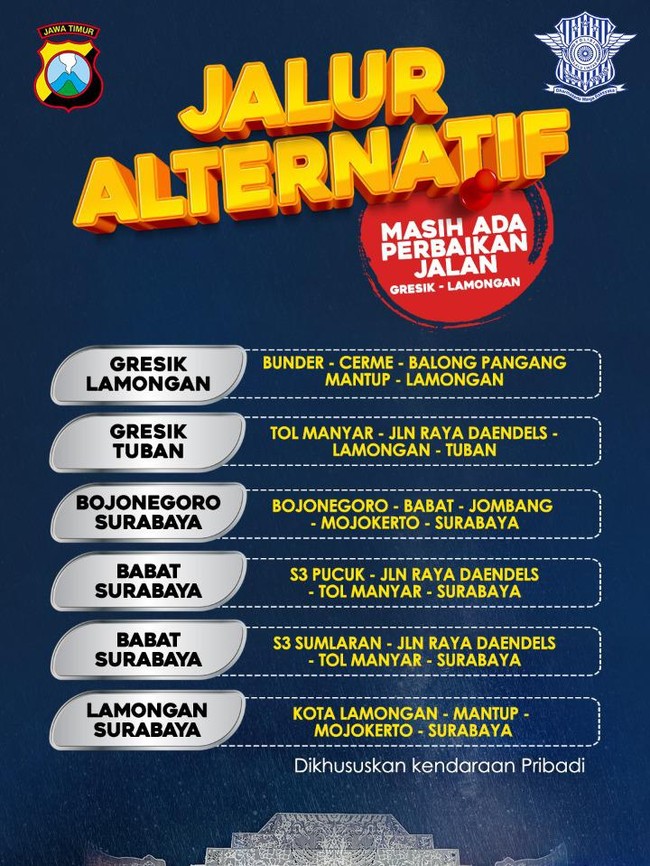 "Kami dari Satlantas Polres Lamongan mengimbau kepada masyarakat untuk menggunakan jalur alternatif, karena di jalur poros tengah masih ada perbaikan jalan di ruas jalan Gresik Lamongan," kata Aristianto kepada wartawan, Senin (13/12/2021).