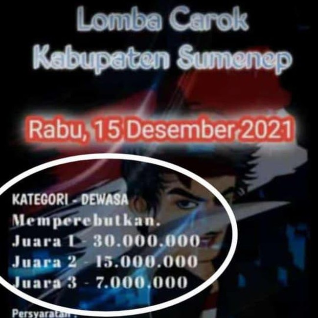 Dalam poster itu diterangkan bahwa lomba carok tersebut akan digelar pada Rabu (15/12). Lomba carok tersebut untuk kategori dewasa, dengan memperebutkan hadiah juara pertama Rp 30 juta. Juara 2 akan mendapat Rp 15 juta dan juara 3 akan mendapat Rp 7 juta.