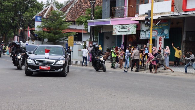 Lambaian tangan warga Bumi Angling Darmo itu mendapat perhatian dari Presiden. Mobil yang ditumpangi Jokowi lantas memelan. Dari dalam mobil terlempar kaos dan buku pelajaran sekolah kepada warga di pinggir jalan.