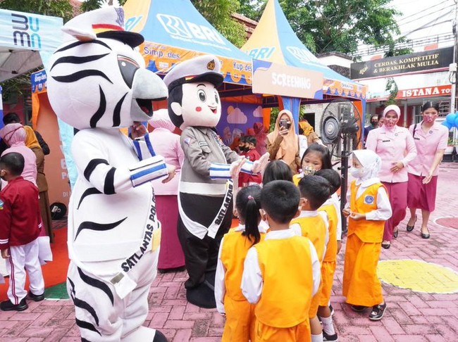 Tak hanya panggung, boneka Semeru berukuran besar juga tampak hadir menghibur anak-anak yang akan dan sudah mengikuti vaksinasi. Kehadiran panggung boneka dan boneka Semeru ini tidak hanya menghibur anak-anak, mereka juga mengajarkan pada anak-anak ini arti penting tertib berlalu lintas.